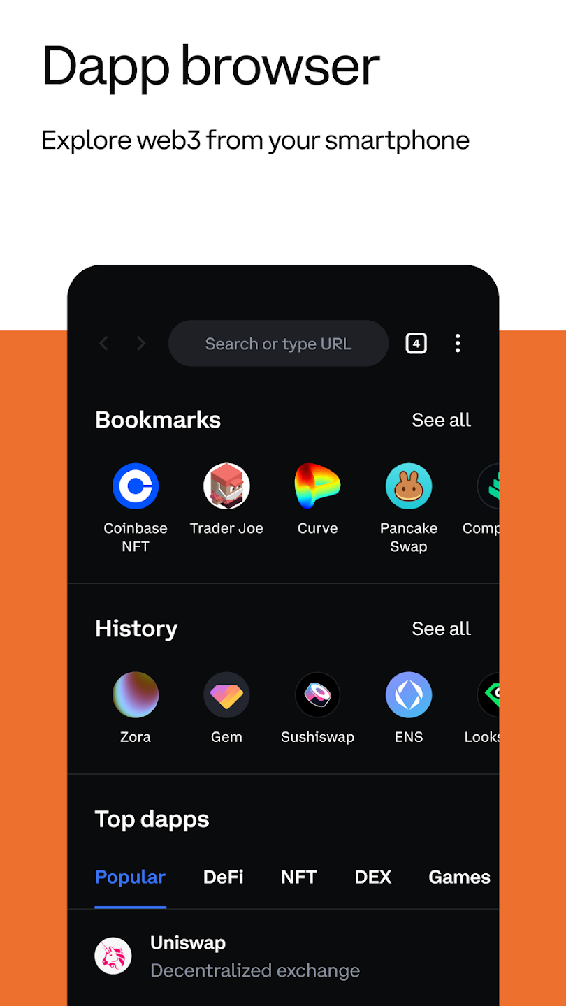 معمولا یکی از کیف پول های پیش فرضی که می توان به بسیاری از برنامه های غیر متمرکز متصل کرد، کیف پول کوین بیس (Coinbase Wallet) است.