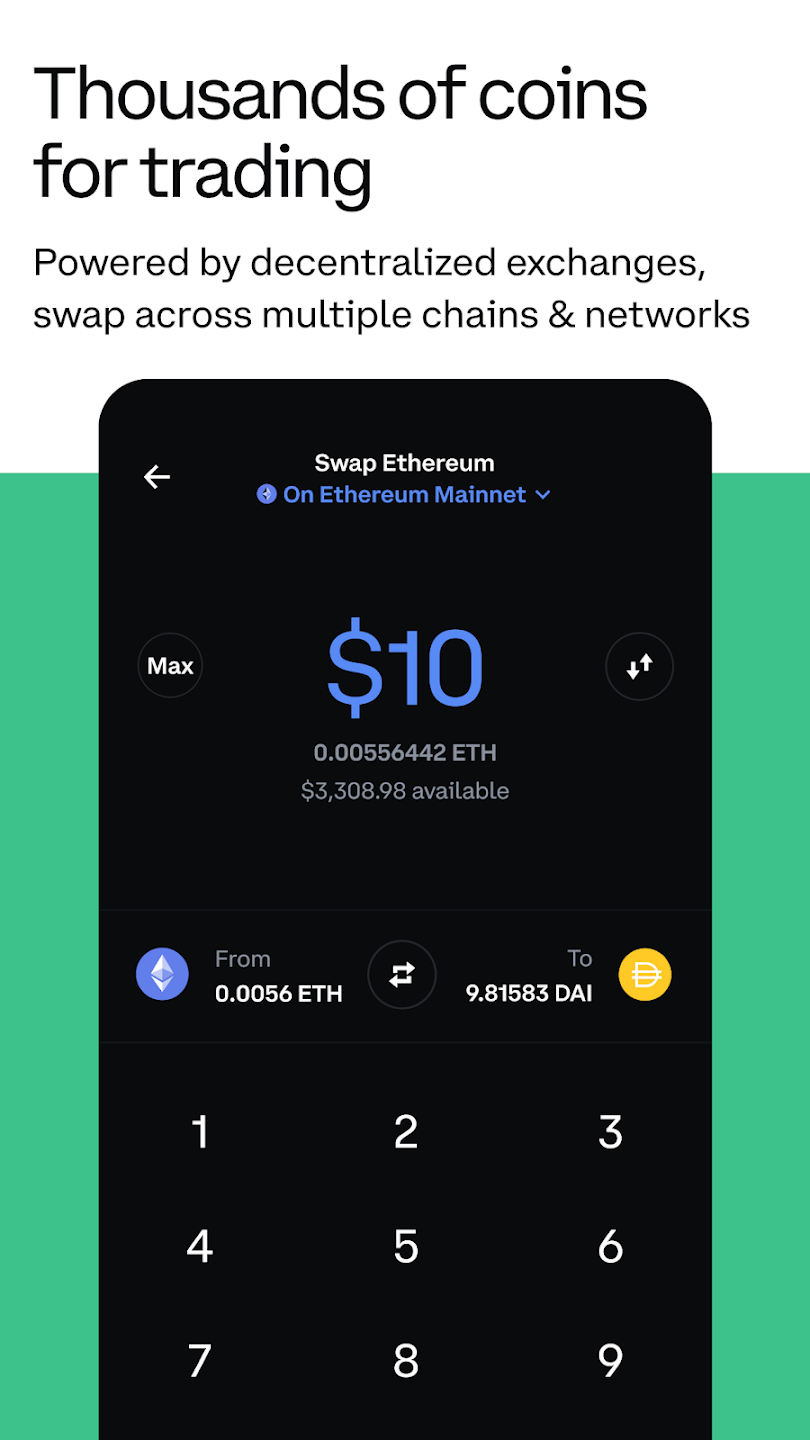 در صفحه اصلی کیف پول گزینه Swap وجود دارد که به کمک آن می توانید، رمز ارزهای مختلف را در صرافی های غیرمتمرکز مبادله کنید. فعلا فقط امکان سواپ رمزارزهایی که بر بستر شبکه های اتریوم، آوالانچ، BNB Chain و پالیگان هستند، فراهم شده است. همچنین سواپ ها روی یک زنجیره انجام می شوند و نمی توان سواپ کراس چین انجام داد. خود کوین بیس از این سواپ ها ۱ درصد کارمزد می گیرد. این یک درصد در کنار میزان Fee شبکه، در زمان انجام سواپ نمایش داده می شود.
