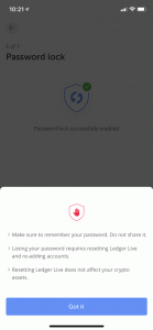 لجر لایو از شما می خواهد یک گذر واژه قفل انتخاب کنید. دلیلش این است که اگر کسی به گوشی تان دسترسی داشت، نتواند جزییات مربوط به دارایی های شما را بر روی لجر مشاهده کند. این مساله بیشتر به حریم خصوصی ربط دارد تا امنیت. گذر واژه را تعیین می کنیم.