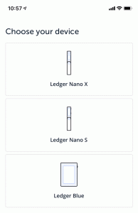 پس از باز کردن این اپلیکیشن، دستگاه مورد نظر برای راه اندازی را انتخاب می کنیم. برای همین گزینه نانو ایکس (Nano X) را انتخاب می کنیم. البته در صورت راه اندازی سایر دستگاه های این شرکت، باید گزینه های دیگر را انتخاب کرد.