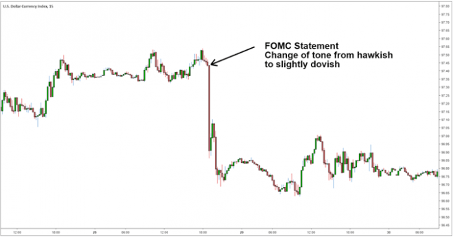 کمی بعد ار ۲۸ نوامبر، کمیته عملیات بازار باز بانک مرکزی آمریکا (FOMC) بیانیه سیاست پولی خود را منتشر کرد که در آن جروم پاول گفته بود “او نرخ بهره را اندکی کمتر از حد خنثی می بیند”. این تغییر مثالی از سناریوی اول است که لحن از هاوکیش به اندکی داویش تغییر پیدا می کند. این تغییر لحن منجر به کاهش ارز شد. در نمودار زیر ببینید چه اتفاقی برای شاخص دلار (DXY) در دوم اکتبر ۲۰۱۸ و سپس در ۲۸ نوامبر ۲۰۱۸ رخ داده است.